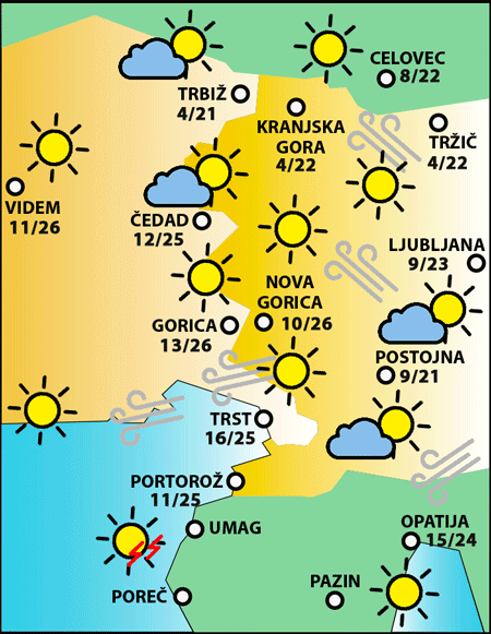 Najnižje jutranje temperature bodo od 5 do 10, v mraziščih okoli 2, najvišje dnevne od 22 do 26 stopinj C.