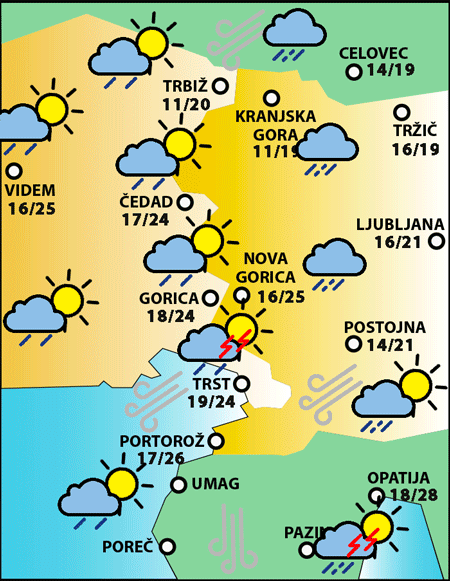 Vremenska napoved Hidrometeorološkega zavoda Republike Slovenije in deželne meteorološke opazovalnice ARPA.