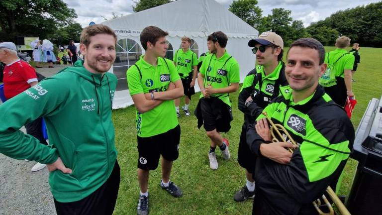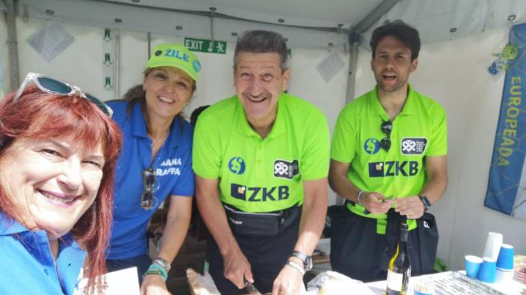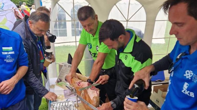 Dogajanje se je nato preselili na velik travnik, ki so ga opremili s šotori in stojnicami. Še dobro, da je bilo tudi vreme ugodno, saj bi dež prav gotovo skazil praznik. Slovenci v Italiji so pod taktirko ZSŠDI in Žil uredili stojnico, ki so jo neuradno poimenovali Zamejska osmica. Predstavili so se s mesnatimi izdelki in siri kraških kmetov ter prestižnimi vini goriških ter kraških vinogradnikov. Na mizo so položili pršut in maser Matej Skerk je dobri dve uri neprestano delil rezine številnim obiskovalcem, ki so oblegali stojnico Slovencev v Italiji. Operativni tajnik ZSŠDI Evgen Ban in selektor Mario Adamič sta delila vinsko kapljico, spremljevalki Rafaella Zavadlav ter Maja Peterin pa sta rezali kruh. Enogastronomska ponudba je bil zadetek v polno, saj je bila tudi ura primerna za »marendo«, če že ne kosilo. Za popolno fešto je poskrbel nogometaš Matija Colja, ki je s seboj prinesel trobento.