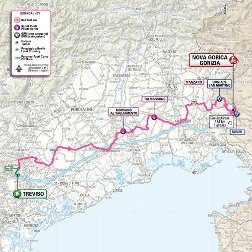 Ob koncu drugega tedna, v soboto, 24. maja, pa bo na sporedu najbolj pričakovan dan za slovenske navijače, saj se bo 14. etapa s startom v Trevisu, po 195 kilometrih, zaključila na Trgu Evrope / Transalpini med Gorico in Novo Gorico. Trasa je še kar razgibana, tako da bi lahko prišlo tako do bega kot do skupinskega sprinta.