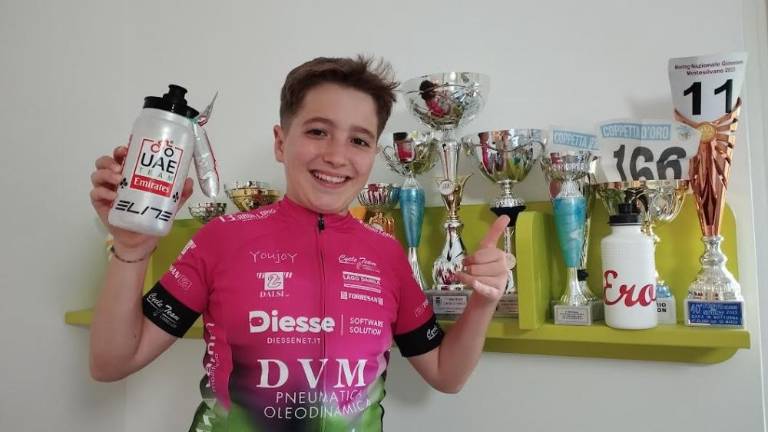 Na ekrančku se je za Mattio prikazala polica, polna pokalov in drugih priznanj, sad zmag in dobrih uvrstitev na dirkah. »To so letošnji, druge imam shranjene v treh polnih zabojih,» je ponosno povedal deček. Z očetom sta obnovila, koliko trenira: ob ponedeljkih, torkih in četrtkih po dve uri, v sredo sta dve uri posvečeni gorskemu kolesu, sobote in nedelje pa so namenjene tekmam, na cesti, a tudi na dirkališču, ker Mattia trenira tudi dirkališčne discipline. Na cestni vožnji, pravi, da mu najbolj paše sprint, a tudi vožnja navkreber mu zelo leži.