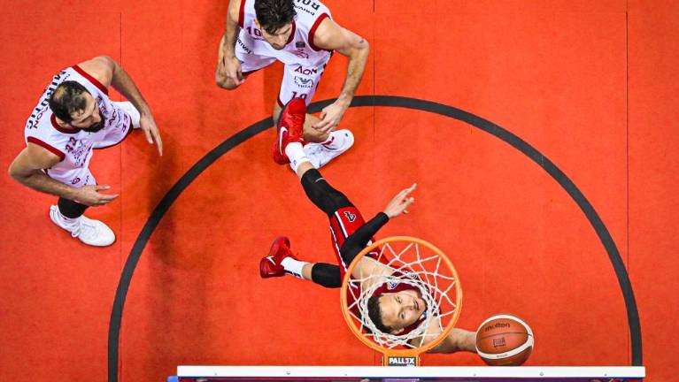 Mitjeva drugouvrščena fotografija je nastala na tekmi 1. kroga italijanske košarkarske A-lige v športni dvorani PalaRubini v Trstu med Pallacanestrom Trieste in milanskim Armanijem. Košarkar, ki ga je Mitja ujel v mrežico, je Američan Colbey Ross.