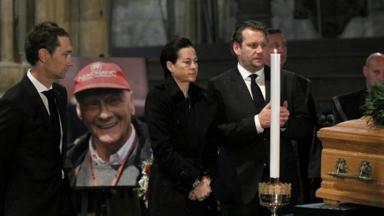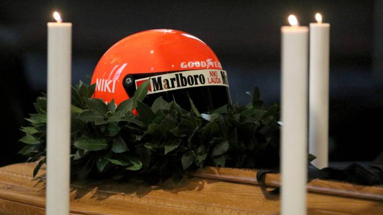 Soproga Birgit je danes zjutraj položila tekmovalno, seveda rdečo, čelado, s katero je osvojil tri naslove svetovnega prvaka, na krsto Nikija Laude, od katerega se je v katedrali sv. Štefana na Dunaju poslovilo okrog 300 častnih gostov, med katerimi so bili Toto Wolff, Lewis Hamilton, Valtteri Bottas, Nico Rosberg, Jean Todt, Chase Carey, Axel Lund Svindal, David Coulthard, Sebastian Kurz, in Daniel Brühl oziroma igralec, ki je Laudo uprizoril v filmu Rush.