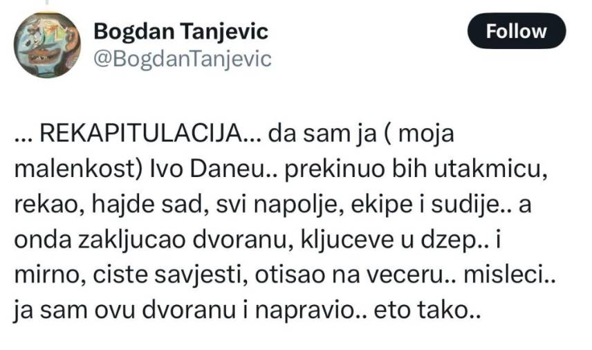 Legendarni trener, ki je z Bosno naslov osvojil leta 1979, pozneje pa je naslove osvajal tudi v Italiji, Franciji in Turčiji, zelo uspešen pa je bil tudi v selektorskih vlogah, je sodnike spomnil, da so iz dvorane napodili najboljšega igralca svetovnega prvenstva leta 1967 in kapetana jugoslovanske reprezentance. Ta je leta 1970 prav v dvorani, ki jo je moral zapustiti, na svetovnem prvenstvu osvojila prvo zlato kolajno za jugoslovansko košarko. »Če bi bil na njegovem mestu, bi prekinil tekmo in zaklenil dvorano. Rekel bi - jaz sem to legendarno halo naredil,« je bil ogorčen Tanjević, ki že več let živi v Trstu.