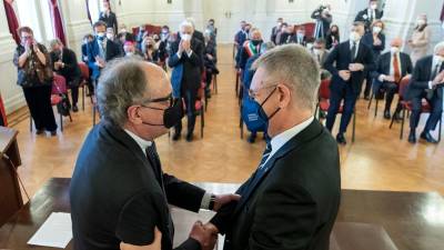 Predsednik Fundacije Narodni dom Rado Race in rektor tržaške univerze Roberto Di Lenarda po podpisu pogodbe (KVIRINAL) Še Zgodovinski trenutek za Slovence v Italiji in tudi za Trst Jaruška Majovski | 28. mar. 2022 | 19:22