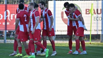 »Delfini« iz Vižovelj (na fotografiji v rdečih dresih) so v letošnji promocijski ligi še brez zmage (FOTODAMJ@N) Šport Sistiana Sesljan visoko izgubil, Sovodenjci v 93. minuti zapravili zmago Spletno uredništvo | 4. okt. 2025 | 19:39