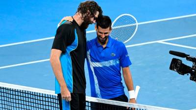 Reilly Opelka in Novak Đoković po tekmi (ANSA) Šport Đoković izgubil proti 293. igralcu sveta STA | 3. jan. 2025 | 16:28