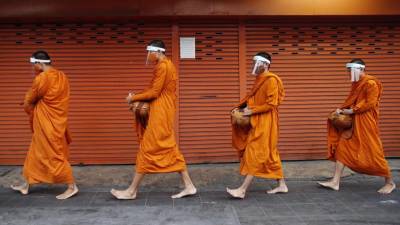 Budistični menihi z obraznimi ščitniki v Bangkoku (ANSA)( ) Še Na Tajskem ne bodo tolerirali prvoaprilskih šal o koronavirusu Spletno uredništvo | 31. mar. 2020 | 15:55