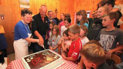 Kuharica Mari in Franko Starec režeta torto (ZVONKO VIDAU) Šport Po 20 letih je Planinska šola SPDT še vedno aktualna Veronika Sossa | 16. jul. 2021 | 7:04