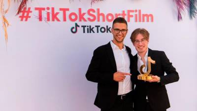 Nik kranjec (levo) in Matej Rimanić na nagrejavanju (CANNES FILM FESTIVAL) Kultura Slovenski kratki film v Cannesu osvojil glavno nagrado TikTok Spletno uredništvo | 23. maj 2022 | 12:28