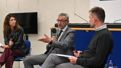 Poveljnik Civilne zaščite Srečko Šestan, ob njem voditelja Alenka Florenin in Aljoša Fonda( Fotodamj@n ) Tržaška Poveljnik Šestan na Opčinah o čezmejni pomoči Jadran Vecchiet | 19. okt. 2023 | 18:45