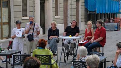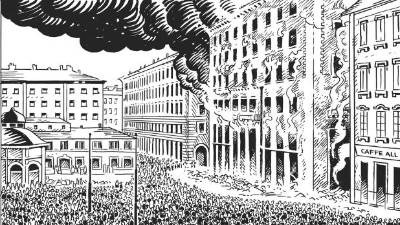 Italijanski prevod stripa Črni plamen so v ponedeljek predstavili pred Kavarno San Marco( FOTODAMJ@N ) Tržaška Presegla sta navijaški pamflet Vesna Pahor | 21. jul. 2021 | 7:22