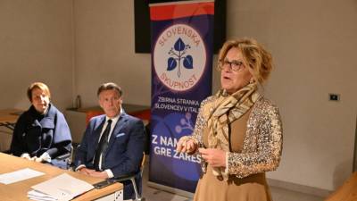 Kandidatka Franka Padovan (desno), v ozadju Fulvia Premolin in Damijan Terpin (FOTODAMJ@N) Še Franka Padovan kandidatka SSk za Evropski parlament na listi SVP Ivan Žerjal | 22. apr. 2024 | 22:07