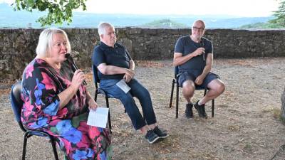 Zadnje nedeljsko predavanje na Dragi 2025, za mizo Valentin Areh, Božo Cerar in Jože Plut (FOTODAMJ@N) Tržaška Jubilejno Drago sklenilo razmišljanje o vojni in miru ter koncu življenja Ivan Žerjal | 15. sep. 2025 | 12:56