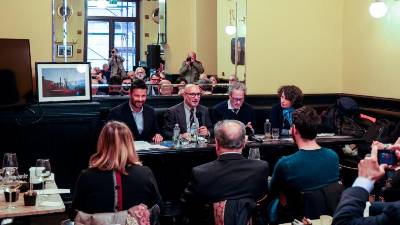 Z leve Babuder, De Filippo, Conte in Mazzolini, na levi pa ena od Contejevih fotografij (LUCA TEDESCHI/FOTODAMJ@N) Tržaška Fotografije o tržaški železarni in njenem koncu Jadran Vecchiet | 10. apr. 2025 | 11:43