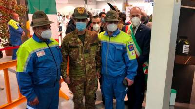 Izredni komisar za covid-19 Francesco Figliuolo med predstavnikoma Civilne zaščite danes v Guminu (A.V.) Še Cepiva bo kmalu dovolj Albert Voncina | 26. apr. 2021 | 15:40