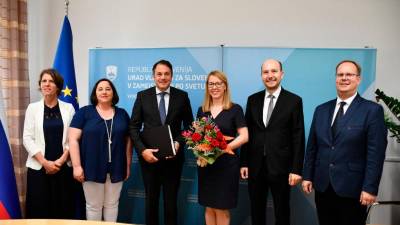 V sredini minister za Slovence v zamejstvu in po svetu Matej Arčon in odhajajoča ministrica Helena Jaklitsch, ob njiju novoimenovana državna sekretarka Vesna Humar in zdaj že nekdanji sekretar Dejan Valentinčič (GOV.SI) Še Matej Arčon prevzel posle ministra za Slovence v zamejstvu in po svetu STA | 3. jun. 2022 | 15:10