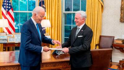 Predsednik ZDA Joseph Biden in novi slovenski veleposlanik v ZDA Iztok Mirošič (VELEPOSLANIŠTVO RS V ZDA) Še Mirošič povabil predsednika ZDA v Lipico Sandor Tence | 30. sep. 2023 | 7:33