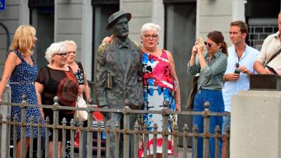 Tržaški kip Jamesa Joycea je med turisti zelo priljubljen (FOTODAMJ@N, fotografija je simbolična) Kultura Na londonski dražbi Joyceovi Dublinčani s posvetilom tržaški učenki Aljoša Fonda | 24. sep. 2019 | 6:11