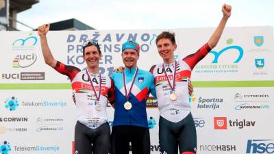 Zmagovalni oder četrtkovega kronometra: Jan Polanc (prvi z leve), državni prvak Jan Tratnik in Tadej Pogačar (KOLESARSKA ZVEZA SLOVENIJE) Šport Jutri v Kopru slovenska kolesarska smetana Spletno uredništvo | 19. jun. 2021 | 17:00