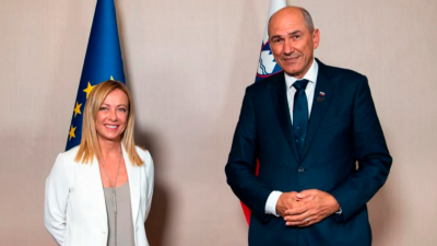 Giorgia Meloni in Janez Janša na Blejskem strateškem forumu leta 2021 (TWITTER) Še Janša slovensko vlado poziva k sodelovanju z zmagovito desnico v Italiji Jaruška Majovski | 26. sep. 2022 | 11:57