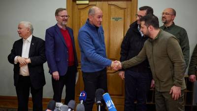 Češki premier Petr Fiala, slovenski premier Janez Janša in poljski premier Mateusz Morawiecki z ukrajinskim predsednikom Volodimirjem Zelenskim in drugimi visokimi funkcionarji (ANSA) Še Zelenskemu povedali, da za Ukrajino podpirajo status kandidatke za EU STA | 16. mar. 2022 | 10:31