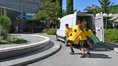 Pred vhod v hotel so protestniki postavili tri rumene sode( Fotodamj@n ) Še Jedrske strokovnjake pričakali protestniki Martin Poljsak | 10. sep. 2024 | 8:20