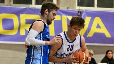 Sokolov kapetan Ivo Ušaj (levo) in Bregov košarkar Matija Terčon (FOTODAMJ@N) Šport Sokolu derbi deželne divizije 2 proti Bregu Erik Piccini | 25. okt. 2025 | 20:32
