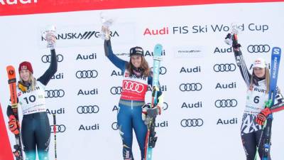 Švedinja Sara Hector z Laro Colturi in Alice Robinson (ANSA) Šport Švedinja Hector zmagala v Kranjski Gori, Dvornik osma Spletno uredništvo | 4. jan. 2025 | 14:40