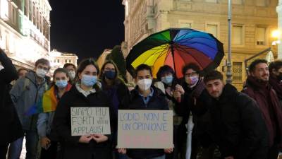 Sovraštvo ni mnenje, je bilo zapisano na transparentih protestnikov( FOTOD@MJAN ) Tržaška Z zastavo miru proti zavrnitvi zakonskega predloga Zan Valentina Sancin | 1. nov. 2021 | 19:30