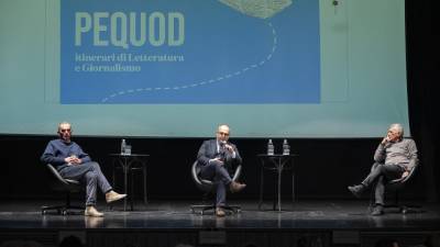 Z leve Franco La Torre, Enrico Bellavia in Attilio Bolzoni na odru gledališča Miela (FOTODAMJ@N) Tržaška Če si mafiji stopil na prste, je tekla kri Sara Sternad | 15. mar. 2022 | 15:57