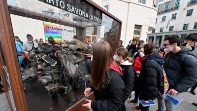 Pločevinasta gmota pred gledališčem Miela - v trajen opomin na mafijske atentate (FOTODAMJ@N) Tržaška Skrotovičena croma kot mafijsko opozorilo Sara Sternad | 14. mar. 2022 | 18:30