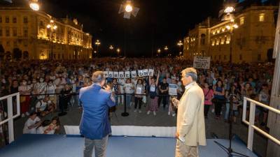 Sinočnje dogajanje na Velikem trgu, levo neapeljski odvetnik Erich Grimaldi, desno odvetnik Alessandro Cuccagna (FOTODAMj@N) Tržaška Na Velikem trgu zagovarjali zdravljenje covida-19 na domu Aljoša Fonda | 20. avg. 2021 | 15:32