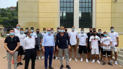 Nogometaši Triestine pred cepilnim centrom v Starem pristanišču, v ospredju deželni odbornik Riccardo Riccardi in izvršni direktor Triestine Mauro Milanese( ) Šport Vbrizg v ramena nogometašev Spletno uredništvo | 13. jul. 2021 | 19:21