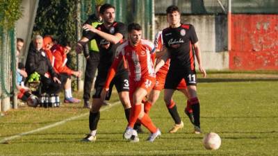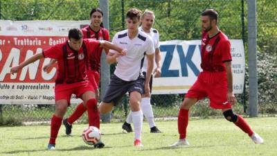 »Delfini« iz Vižovelj (na fotografiji v rdečih dresih) so v letošnji promocijski ligi še brez zmage (FOTODAMJ@N) Šport Sistiana Sesljan visoko izgubil, Sovodenjci v 93. minuti zapravili zmago Spletno uredništvo | 4. okt. 2025 | 19:39