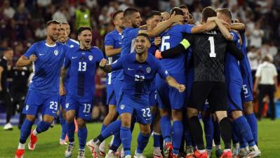 Veselje slovenskih nogometašev po osvojeni točki proti Angliji (ANSA/YOAN VALAT) Šport Slovenija ... gre naprej! Jan Grgič | 25. jun. 2024 | 23:02