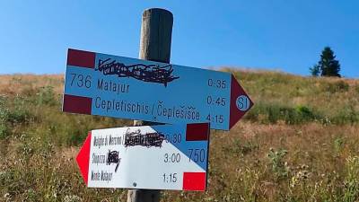 Pomazana kažipota se nahajata v bližini koče Pelizzo (STEFANO COREN) Še Vandali s črno barvo nad slovenske napise na Matajurju Novi Matajur | 30. jul. 2024 | 15:45