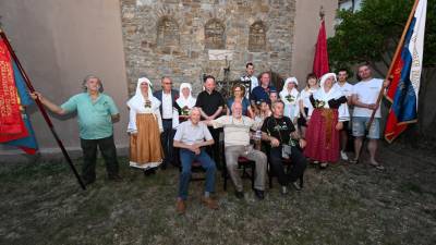Botri, praporščaki, noše in trojica vaščanov pred staro uro (FOTODAMJ@N) Tržaška Poklonili so se prednikom v Bl'uncu (video) Martin Poljsak | 25. jun. 2022 | 16:54