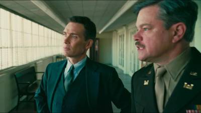 Robert Oppenheimer (Cillian Murphy) in Leslie Groves (Matt Damon) v filmu Oppenheimer (WIKIPEDIA) Kultura Oppenheimer s kar 13 nominacijami za oskarja STA | 23. jan. 2024 | 16:08