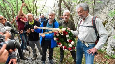 Na steno Počivenca v dolini Glinščice so namestili venec v spomin na 18 tržaških slovenskih in italijanskih gornikov (FOTODAMJ@N) Tržaška Venec za gornike, padle za svobodo Spletno uredništvo | 25. apr. 2019 | 10:31