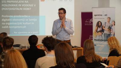 Predavatelj je poslušalce neposredno vključeval v pogovor in jih vabil k razmišljanju (BUMBACA) Goriška Vodja mora imeti čas za razmislek, za ljudi in zase Petra Ciglic | 27. feb. 2024 | 9:55