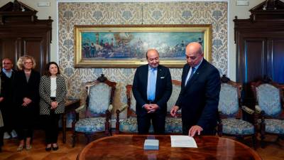 Tržaški prefekt Pietro Signoriello in župan Roberto Dipiazza včeraj v sinji dvorani mestne hiše (LUCA TEDESCHI/FOTODAMJ@N) Tržaška S Slovenci kot bratje v Evropi Sara Sternad | 28. maj 2025 | 9:29