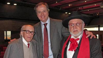 Pred devetimi leti so se na simpoziju Pahoriana danes v ljubljanskem Cankarjevem domu srečali (z leve) Boris Pahor, njegov francoski založnik Pierre Guillaume de Roux, čigar življenje je bolezen pretrgala lani, in Evgen Bavčar. (ANDRAŽ GOMBAČ)( ) Kultura Skozi Francijo je prišel v Trst in Slovenijo Evgen Bavčar | 6. jun. 2022 | 7:50
