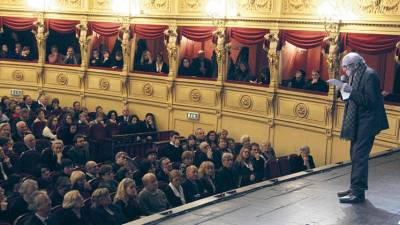 Boris Pahor je leta 2010 ob uprizoritvi Nekropole v italijanščini in slovenščini nagovoril razprodano Verdijevo gledališče (FOTODAMJ@N) Kultura Ne pištola, odmeval je aplavz! Andraž Gombač | 7. jun. 2022 | 9:44
