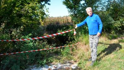 Andrej Sulič ob nevarnem jarku, ki ga je sam označil z opozorilnimi trakovi (K.M.) Goriška Kolesarska pot ob reki Vipavi se prekine z nevarnim jarkom Katja Munih | 21. okt. 2021 | 10:45