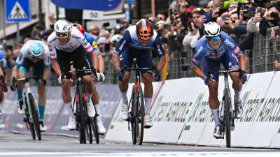 Ciljni sprint: zmagovalec Philipsen (prvi z desne), drugouvrščeni Matthews in tretjeuvrščeni Pogačar (ANSA)( MARCO BERTORELLO / ANSA ) Šport Pogačar tretji v Sanremu, zmaga Philipsenu Erik Piccini | 16. mar. 2024 | 17:19
