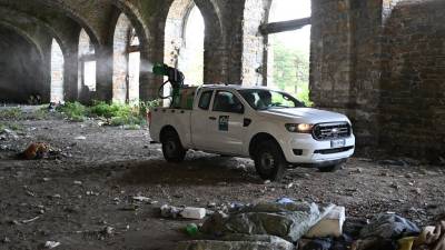 Stavbo so razkuževali tudi z razpršilcem na vozilu( Fotodamj@n ) Tržaška Začeli so s čiščenjem silosa (video) Martin Poljsak | 18. sep. 2024 | 19:29