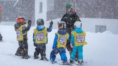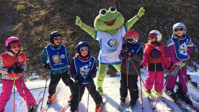 Tečajniki z maskoto ZSŠDI žabico Skokico, s katero se bodo srečali ob koncu sezone (FB/SK BRDINA) Šport Za zdaj je snega malo, zanimanje za smučarske tečaje pa je veliko Erik Piccini | 12. jan. 2023 | 9:07