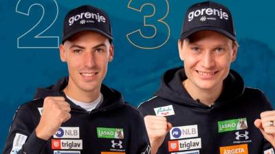 Domen Prevc (levo) in Anže Lanišek v rumeni majici vodilnega v svetovnem pokalu (ANSA) Šport Lanišek zmagal in prevzel skupno vodstvo, Domen Prevc tretji Spletno uredništvo | 26. nov. 2025 | 18:37