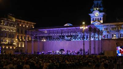 Množica obiskovalcev na Velikem trgu (TEDESCHI/FOTODAMJ@N) Tržaška Velikani italijanske glasbe peli za demokracijo Urška Petaros | 6. jul. 2024 | 19:55